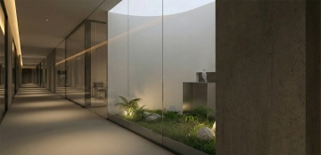 现代简约风格的高端酒店外观,黄昏时分,温暖的橙黄色灯光从建筑内部透出,照亮带有水平线条的米棕色石材与木质装饰立面,宽敞的入口门廊有整齐排列的嵌入式灯带和支撑柱,门前停放着几辆轿车,周围环绕着绿树,天空呈现从浅蓝到粉紫的渐变暮色,建筑整体采用对称布局,具有清晰的垂直与水平线条结构,光影对比柔和,营造出宁静而奢华的氛围。