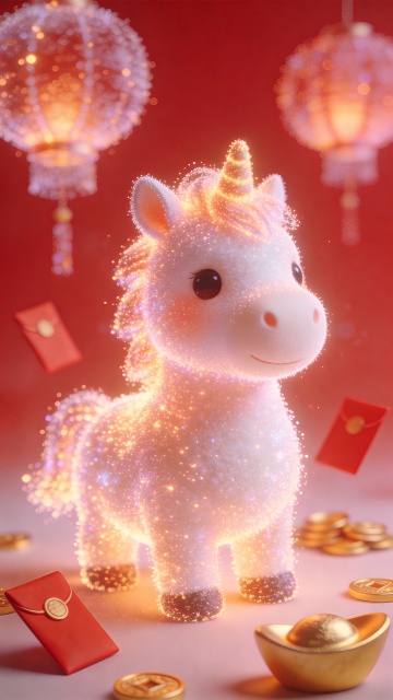 软3D风可爱独角兽手持鎏金元宝,毛发生长质感细腻,梦幻粉红背景点缀金币与福袋,喜庆新春氛围浓厚。