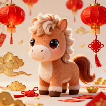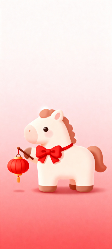 软3D粘土风卡通马,手持金元宝与福袋,搭配红灯笼,喜庆可爱,充满春节氛围。