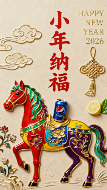 剪纸风与拼贴艺术融合,红马饰以国潮花纹,搭配金元宝、灯笼与祥瑞元素,营造喜庆中式氛围,展现丙午马年节日祝福。