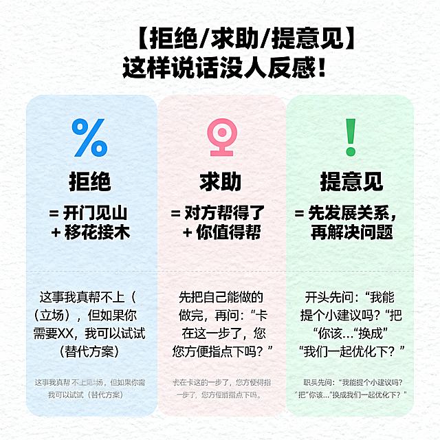 ✨【高阶沟通技巧·直接抄作业】 💡 破冰秘诀:不是秀自己,而是给对方掌控感 👉 用“双线卡位法”: “听说您之前做过XX项目,我正好在学,能请教个问题吗?” 再加一句:“这是我的微信,您方便时随时找我~” 💡 赞美公式 = 打追光 + 轻轻地 + 深深地 + 常常地 别只说“你好厉害”,要说: “你刚才提到的那个细节(具体!),让我突然想到…(影响) 你是怎么想到的?” 💡 批评不说“你错了”,而是:“来,我们刷新一下” 用“下拉刷新”比喻:覆盖旧行为,启动新动作。 👉 甚至可以主动说:“领导,我又犯错了,请帮我刷新一下!” 💡 道歉不是认错,而是承诺未来增量 ❌ “对不起我搞砸了” ✅ “我知道你很失望(接情绪),接下来我会…(行动),以后这类事绝不再发生(承诺)”详情