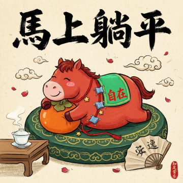 国潮风卡通马拟人躺卧,水墨质感背景,手持柿子寓意“事事如意”,茶香袅袅,扇面题“安逸”,传递舒适自在的中式生活美学。