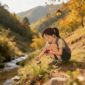 水彩风动漫插画,少女溪边洗衣,衣衫随风轻扬,清新舒适,质朴自然。