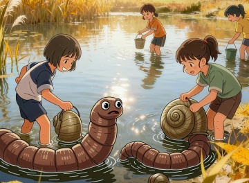 清新水彩插画风,卡通人物在溪流中嬉戏,尽显夏日欢乐。