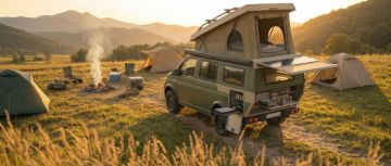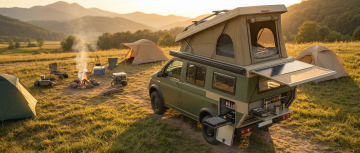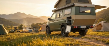水彩风插画,融合国潮与水墨元素,描绘一家人在雪景中房车野餐的温馨场景,红灯笼与气球点缀,传递新春喜庆与团圆之乐。