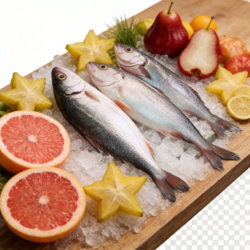 高清晰商业摄影风格,浅色柔和背景,俯视角拍摄的新鲜海鲜组合,包括一只完整的波士顿龙虾、几条银色带光泽的海鲈鱼、三只饱满的青口贝、两只鲜活的大虾和一块切开的三文鱼排,所有海鲜排列整齐形成自然的视觉层次,光线从左上方45度角照射,突出海鲜表面的湿润质感和细腻纹理,色彩真实自然,红色、粉色、银色和青灰色形成和谐对比,画面干净无杂物,主体清晰突出,具有强烈的生鲜食品广告视觉效果。