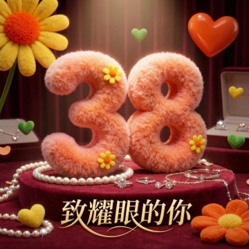 毛发生长风3D数字“38”点缀雏菊,搭配珍珠珠宝与爱心元素,营造甜蜜温馨梦幻氛围,奢华感与可爱感交织,致敬闪耀女性。