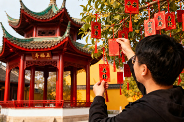 国潮风与重拟物风融合,刺绣细节精致,鎏金元素点缀,实景感十足的中式庭院中,母女共挂祈福牌,红灯笼映衬喜庆氛围,传递新年祝福。