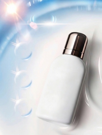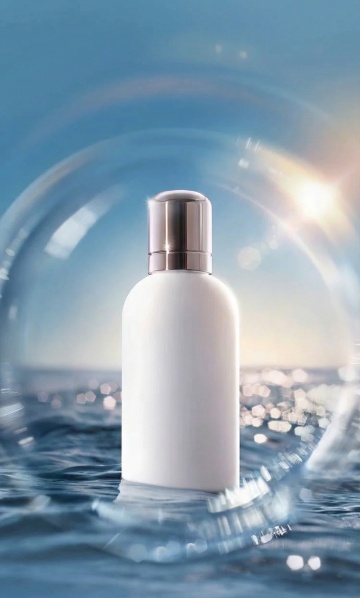 清透玻璃瓶置于水波之上,光影流动,液态感与轻拟物设计交织,传递夏日清爽与柔和舒适。