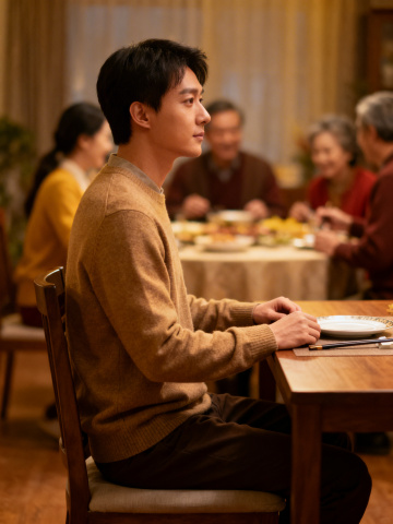 国潮风与重拟物结合,中式庭院实景中,全家围坐圆桌共庆新春,红金刺绣服饰映衬喜庆氛围,油画质感呈现温暖团圆时刻。