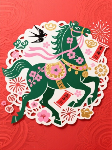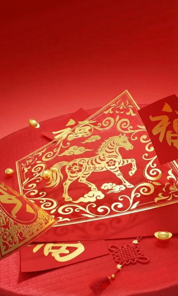 剪纸风与国潮融合,红金配色营造喜庆中式氛围,轻拟物手法呈现马年祥瑞,灯笼、烟花、元宝点缀节日欢庆。