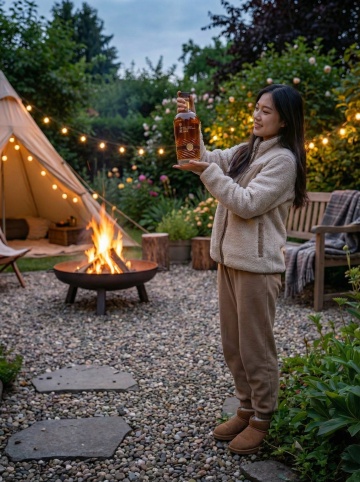 在豪华游艇的甲板上,黄昏时分,琥珀色的威士忌酒液盛在带有菱形切割纹路的水晶杯中,杯内漂浮着大块透明冰块,旁边是一瓶带有黑色瓶盖的方形玻璃酒瓶,酒瓶和酒杯置于深色木质甲板上,散落着几块备用冰块,背景是渐变的橙黄色晚霞与深蓝色海面,温暖的侧逆光从海面方向照射过来,在酒液和冰块上形成璀璨的高光和金色反光,营造出奢华、惬意而又带有一丝神秘的氛围,整体采用写实主义风格,光影对比强烈,细节质感丰富,色彩以琥珀色、深蓝色和金色为主,构图采用经典的产品静物布局,突出威士忌的醇厚与优雅。