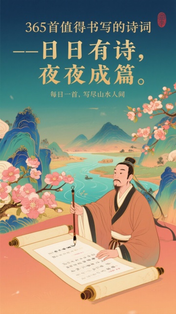 古典插画风,水墨渲染,展现古人织史成诗的雅致场景。
