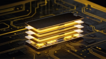 超写实3D渲染风格的电路板特写,中央位置有一个造型变换为六边形的处理器芯片,芯片表面呈现深邃的紫色调并散发着柔和的紫色光芒,周围环绕着金色的光晕。电路板上的线路和电子元件造型进行了未来感的几何化调整,整体色彩变换为以深邃的紫色和神秘的靛蓝色为主色调,搭配金色的电路纹理和点缀其间的亮青色光点,营造出高科技、神秘而充满未来感的氛围。光线从芯片中心向四周柔和辐射,形成清晰的光影层次,背景中的电路板细节丰富,具有细腻的金属质感和精密的结构,整体构图保持中心聚焦的对称美学,突出主体芯片的视觉冲击力。