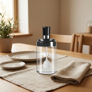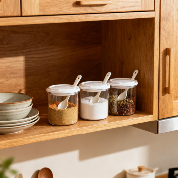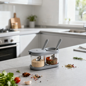 俯视角构图,现代极简主义厨房中央的中岛台特写,台面上铺着浅灰色大理石纹石英石,右侧并排放置着三个哑光黑陶瓷碗,碗中分别盛有:碾碎的藏红花丝、深棕色肉桂棒和浅金色燕麦片。中岛台左侧立着一个透明玻璃水壶,壶中漂浮着几片青柠,旁边斜靠着一本翻开的硬壳食谱,书页边缘露出手绘的香料插图。台面下方悬挂着三个几何形黄铜吊灯,灯光在台面上形成三个重叠的暖黄色光斑。背景中,白色哑光橱柜与原木色开放格交错排列,开放格里整齐码放着带标签的玻璃储物罐,最上层角落摆着一盆垂吊的绿萝,藤蔓自然垂落在白色瓷砖墙面上。阳光从右侧的百叶窗斜射进来,在地面投射出规则的条形光影,整体色调以灰白为底,点缀原木色的温暖和黄铜的轻奢质感,构图采用对角线平衡,视觉焦点集中在中岛台的香料碗与光影交错处。