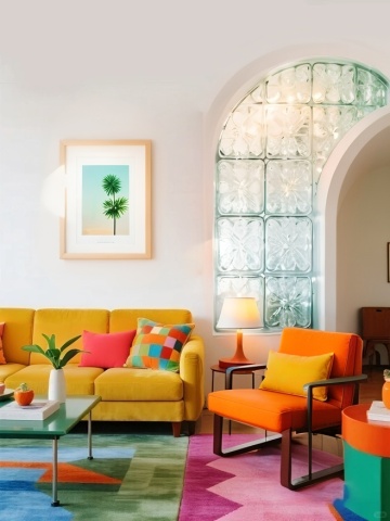极简主义风格室内场景,明亮通透的空间,以米白色和浅卡其色为主色调,柔和的自然光从拱形窗户洒入,在墙面投下清晰的光影纹路,浅米色布艺沙发搭配绿色和橙色抱枕,地面铺有浅绿色地毯,角落摆放一盆绿植,墙面装饰有竖条纹肌理设计,整体呈现出简约、舒适、温暖的居家氛围,空间布局开阔,线条流畅,材质质感细腻,光影层次丰富。