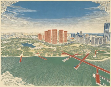 国潮风刺绣插画,融合长城、天坛与现代城市,拟人兔举灯笼共赏月饼,梦幻温馨,喜庆可爱,民族与现代交融。