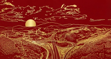剪纸风与版画风融合,红金配色彰显中式喜庆,长城蜿蜒于山河之间,月升云海,国潮意境浓烈,民族风情尽显。