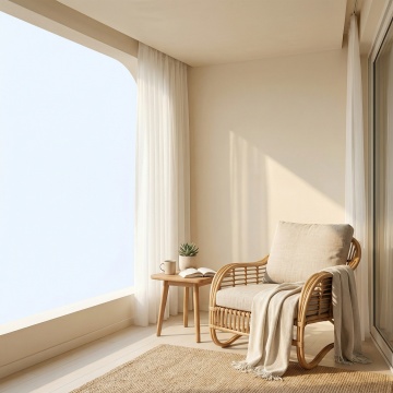 清新自然的极简客厅,柔和光影洒落,米白沙发搭配浅绿针织毯,轻拟物设计与真实质感交织,营造舒适宁静的居家氛围。