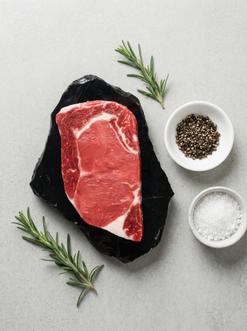 两块纹理清晰、色泽鲜红的生牛排,表面分布着白色脂肪纹理,置于铺有粗麻布的古朴木质餐桌上,周围散落着新鲜迷迭香、八角、红辣椒和黑胡椒粒,一小碗混合香料置于牛排旁,背景为暖色调的乡村厨房环境,光线柔和,突出食材的新鲜质感,整体氛围温馨自然,具有浓郁的美食摄影风格,高分辨率,细节丰富,色彩饱满。