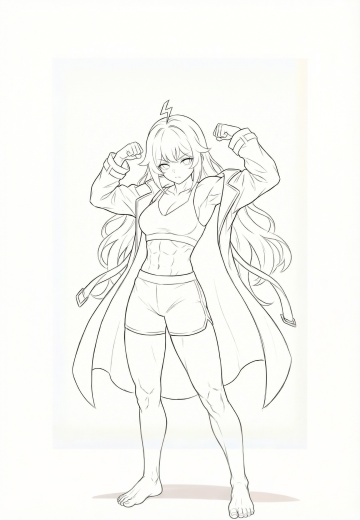 动漫风白描插画,热血感十足的少女角色,线条流畅展现体积感,双臂紧握肌肉上扬,充满力量与自信。
