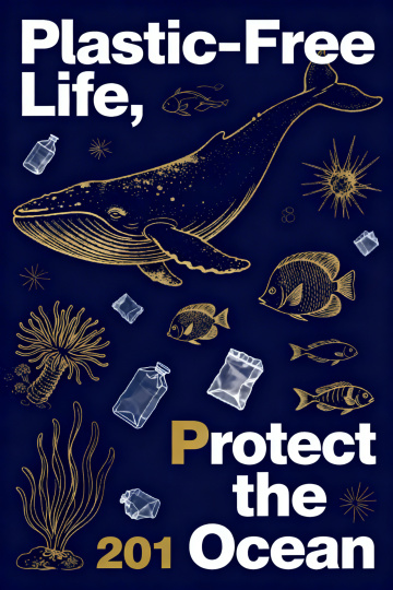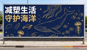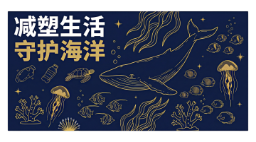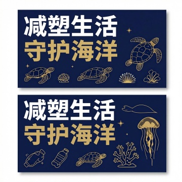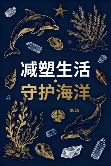 剪纸风插画,单色蓝白呈现海洋生态,海龟被困渔网与塑料瓶间,融合中式美学与环保主题,简约而富有文艺感。