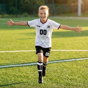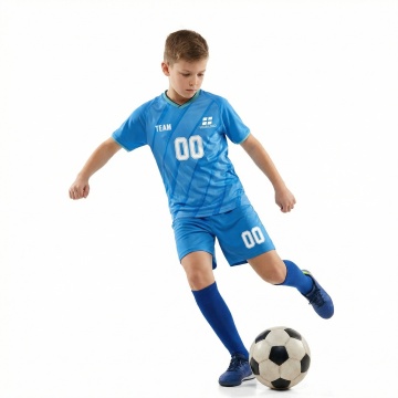 卡通感与扁平风结合,动漫风格人物踢球瞬间,简约主义线条勾勒动感姿态,轻拟物设计增强视觉冲击,无节日信息。