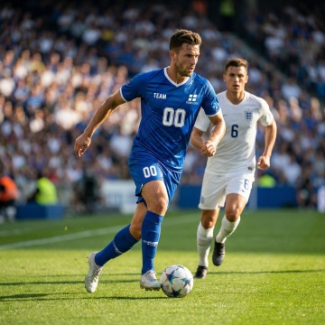 写实摄影风格,阳光明媚的足球场上,一名身着红色球衣的足球运动员正全力踢向足球的动感瞬间,运动员姿态舒展,腿部肌肉线条紧绷,足球表面纹理清晰,绿色草坪在夕阳暖金色光线照射下显得生机勃勃,背景有模糊的其他球员和观众席轮廓,天空中飘着少量白云,整体画面光影对比强烈,高光处有自然的光晕效果,氛围充满活力与运动激情,动态感十足,细节丰富,色彩真实和谐,具有电影般的画面质感和身临其境的临场感。