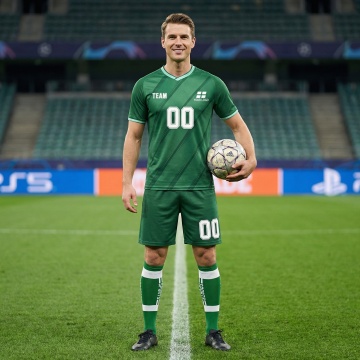 一张展现足球运动员动态瞬间的高质量摄影风格海报,画面中央是身着红色运动服的足球运动员正全力踢向足球的特写镜头,运动员姿态舒展充满力量感,足球上的黑白纹路清晰可见,绿色的足球场上草叶细节丰富。背景是夕阳西下时分的天空,橙黄色的阳光洒在整个场景上,形成温暖而富有戏剧性的光影效果,远处有模糊的其他球员和看台轮廓,天空中点缀着少量白色云朵。整体画面采用三分法构图,主体突出,色彩以红、绿、橙黄为主色调,光影对比强烈,高光和阴影细节丰富,营造出充满活力、激情四射的运动氛围,具有极强的视觉冲击力和信息传达效率,符合体育赛事宣传海报的设计感和目标受众审美。