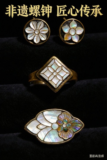 特写镜头,展现一双巧手正在进行创作。一只手用金线在深蓝色的丝绸上绣出玉兔望月的图案,针脚细密,光泽流动。另一只手则在制作一幅结合了剪纸和皮影的艺术品,红色的长城剪纸作为背景,一个半透明的玉兔皮影置于其上,背后有暖黄色的灯光透出,形成迷人的光影效果。背景中,桌面的一角可以看到螺钿漆器闪烁的碎片光芒。整个画面构图精致,充满手作的温暖和古老工艺在现代被唤醒的感动。