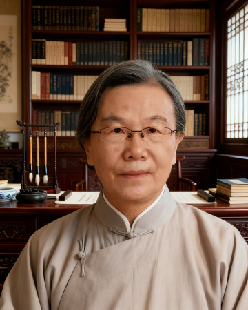 写实风格摄影,画面整体采用柔和的靛蓝色与暖橙色对比色调,一位约四十岁左右的中年男子,身着象牙白传统中式长衫,正专注地在古朴的木质茶桌前进行茶道仪式,他手持茶勺,神情沉静而专注,眼神温和。背景是深色木质博古架,上面整齐摆放着多个靛蓝色与橙色渐变的陶瓷茶罐,左侧悬挂着一盏散发暖橙色光芒的中式纸灯笼,灯笼上有模糊的书法文字。茶桌上摆放着靛蓝色的茶碗、深色陶制茶炉、茶则、茶针等茶道器具,还有一本打开的线装古籍。整体光影柔和,侧逆光勾勒出人物的轮廓,营造出宁静、典雅而略带现代感的氛围,画面构图遵循三分法,人物位于右侧黄金分割点,前景茶具清晰,背景书架稍显虚化,形成自然的景深效果,色彩和谐统一,细节丰富,质感细腻,展现出传统茶道文化的韵味与中年男子沉稳内敛的气质。