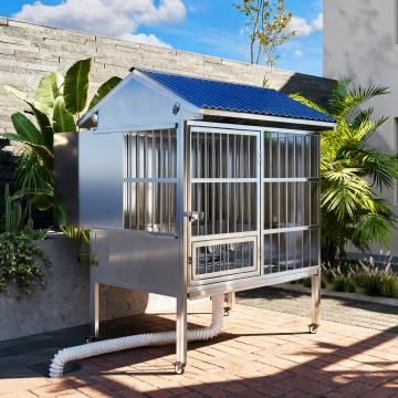 现代感金属风狗屋,3D重拟物设计,工业质感十足,搭配蓝色屋顶与通风管道,科技感与自然环境融合。