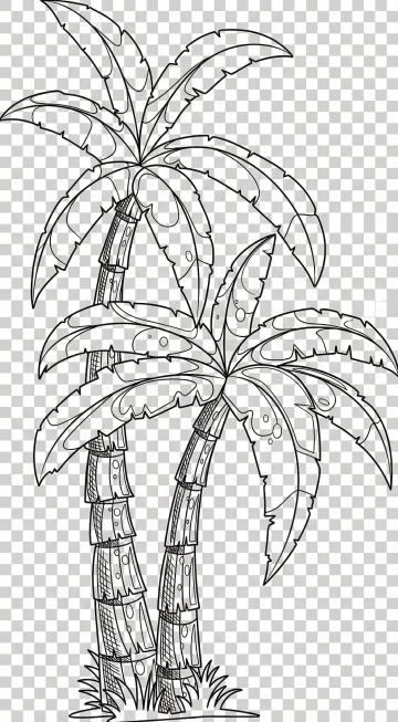 卡通风格插画,两棵椰树,树干呈棕色带有横向环状纹理,顶部绿色羽状叶片舒展,树干底部连接黄色不规则形状的沙地,整体线条简洁流畅,色彩鲜明,无背景,平面设计感,椰树形态卡通化,叶片边缘有白色线条装饰,沙地带有简单光影效果。