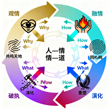 现代感与科技感融合的抽象视觉,采用扁平风与超级符号设计,几何构图呈现情感演化循环。简约主义风格结合印刷风色彩渐变,传递“人—情 情—道”主题,寓意情感共鸣与自我重塑。