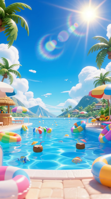 清新软3D风,卡通海岛场景,椰树、躺椅与冲浪板,夏日度假氛围。