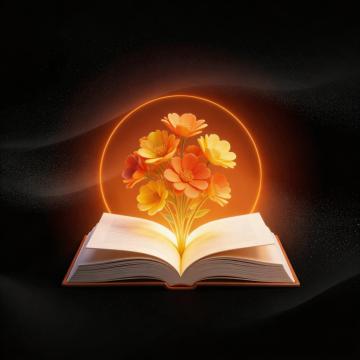 3D风格的梦幻书页中绽放出橙色花束,粒子光影环绕,虚拟自然与文艺感交织,唯美感十足。