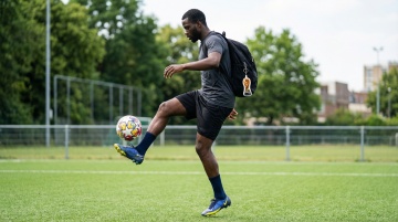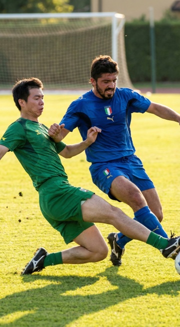 写实摄影风格,阳光明媚的足球场上,一名身着红色球衣的足球运动员正全力踢向足球的动感瞬间,运动员姿态舒展,腿部肌肉线条紧绷,足球表面纹理清晰,绿色草坪在夕阳暖金色光线照射下显得生机勃勃,背景有模糊的其他球员和观众席轮廓,天空中飘着少量白云,整体画面光影对比强烈,高光处有自然的光晕效果,氛围充满活力与运动激情,动态感十足,细节丰富,色彩真实和谐,具有电影般的画面质感和身临其境的临场感。