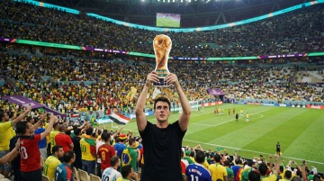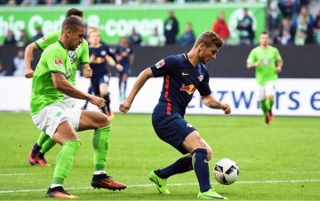 一张展现足球运动员动态瞬间的高质量摄影风格海报,画面中央是身着红色运动服的足球运动员正全力踢向足球的特写镜头,运动员姿态舒展充满力量感,足球上的黑白纹路清晰可见,绿色的足球场上草叶细节丰富。背景是夕阳西下时分的天空,橙黄色的阳光洒在整个场景上,形成温暖而富有戏剧性的光影效果,远处有模糊的其他球员和看台轮廓,天空中点缀着少量白色云朵。整体画面采用三分法构图,主体突出,色彩以红、绿、橙黄为主色调,光影对比强烈,高光和阴影细节丰富,营造出充满活力、激情四射的运动氛围,具有极强的视觉冲击力和信息传达效率,符合体育赛事宣传海报的设计感和目标受众审美。