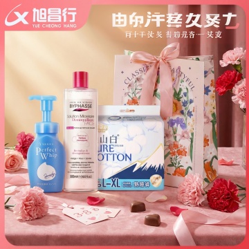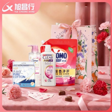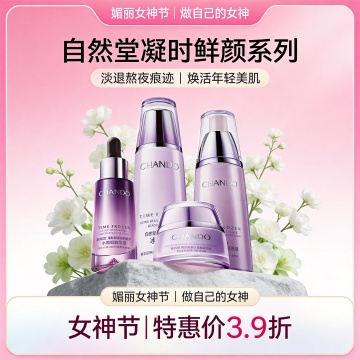 轻拟物风搭配3D玻璃质感,柔和粉紫渐变背景,点缀清新白花,营造甜美时尚氛围,浮雕式产品呈现,突出女神节促销主题。