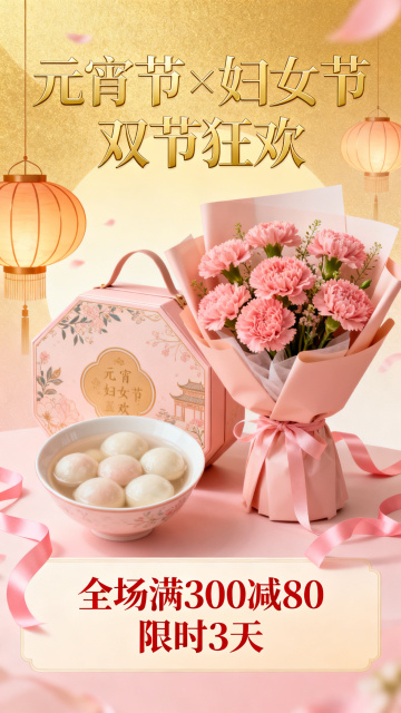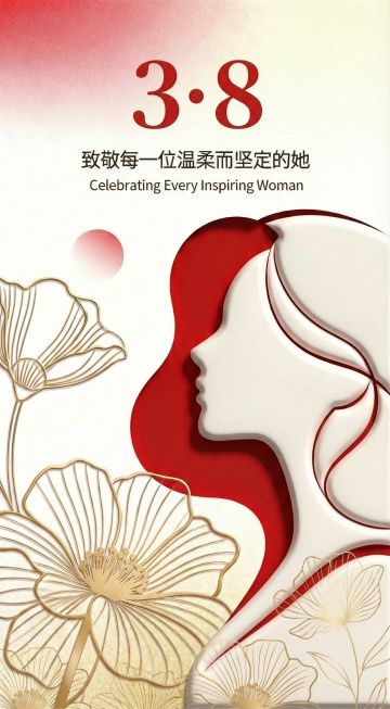 剪影风与撕纸艺术结合,鎏金线条勾勒花卉,浮雕质感呈现优雅女性轮廓,红白渐变背景营造柔和奢华氛围,致敬三八妇女节的唯美时尚。