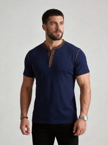 现代简约风格,深蓝与棕褐撞色拼接,展现商务与时尚融合的质感,面料纹理细腻,突出舒适与质朴感,实景拍摄强化真实穿着体验。