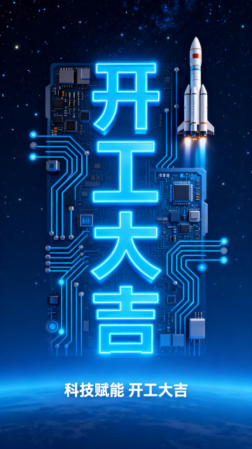 赛博朋克风3D海报,霓虹蓝大字“开工大吉”嵌入电路板,火箭升空,科技感与未来感交织,光影与金属质感凸显酷炫体积感。