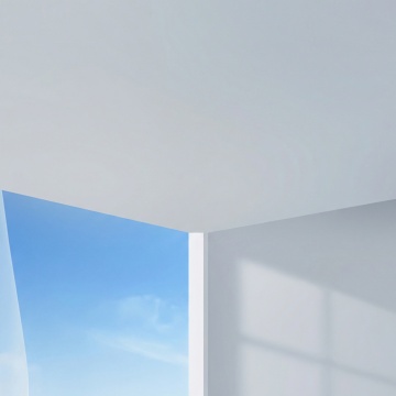 极简主义风格的白色空旷空间,纯净的白色主色调,顶部天窗投射下明亮的自然光,在地面和墙面形成清晰的光影线条,光滑的白色地面反射光线,营造出明亮、通透、宁静的氛围,写实风格,空间宽敞,没有多余装饰,光线柔和而富有层次感,整体呈现出简洁、现代、高级的设计感。