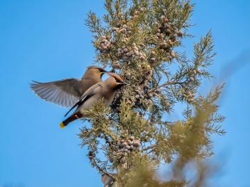 清晨柔和的自然光线下,一只飞鸟——头部黑色、脸颊白色、喉部橙棕色、背部蓝灰色、腹部浅色的小鸟,正展翅悬停,用喙啄食一簇鲜艳饱满的红色浆果,浆果长在纤细的绿色枝条上,背景是模糊的深绿色自然景致,带有浅圆形光斑,整体呈现出高清写实的野生动物摄影风格,画面聚焦于飞鸟与浆果的互动瞬间,光影柔和,色彩对比鲜明,营造出生动自然的氛围。