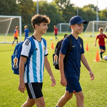 一张展现足球运动员动态瞬间的高质量摄影风格海报,画面中央是身着红色运动服的足球运动员正全力踢向足球的特写镜头,运动员姿态舒展充满力量感,足球上的黑白纹路清晰可见,绿色的足球场上草叶细节丰富。背景是夕阳西下时分的天空,橙黄色的阳光洒在整个场景上,形成温暖而富有戏剧性的光影效果,远处有模糊的其他球员和看台轮廓,天空中点缀着少量白色云朵。整体画面采用三分法构图,主体突出,色彩以红、绿、橙黄为主色调,光影对比强烈,高光和阴影细节丰富,营造出充满活力、激情四射的运动氛围,具有极强的视觉冲击力和信息传达效率,符合体育赛事宣传海报的设计感和目标受众审美。