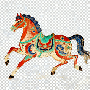 鎏金浮雕风插画,三匹金马奔腾于祥云之上,配以红梅、灯笼与金元宝,尽显中式奢华喜庆,国潮韵味十足。