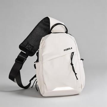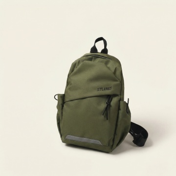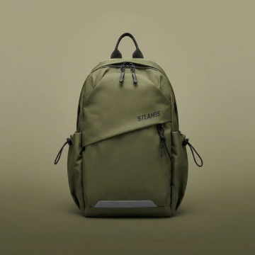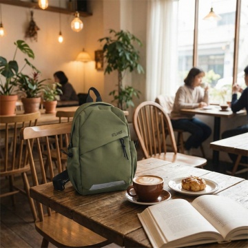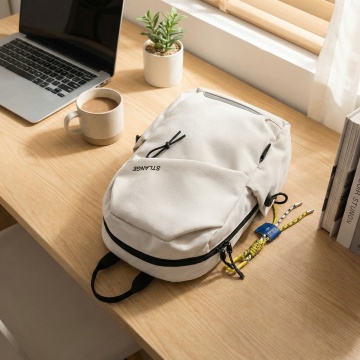 简约主义风格,柔和色调背包置于温暖阳光下,营造舒适感与宁静氛围。