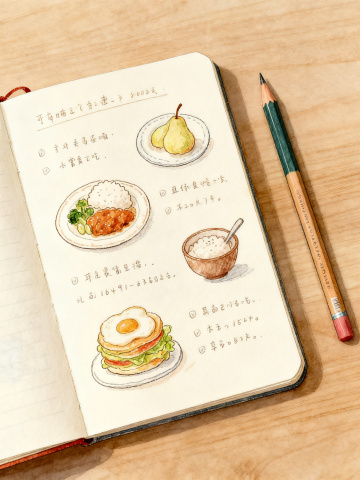 温暖插画风,手账感十足的夜晚书桌场景,柔和水彩色调营造温馨舒适氛围,卡通人物专注书写,月光与台灯交织,传递静谧治愈的自我关怀时刻。