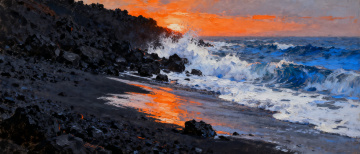 水彩风插画,宽阔海面映衬梦幻落日,清新色彩营造浪漫氛围。
