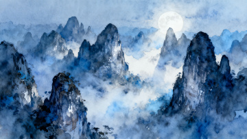 竖幅构图,水墨晕染技法绘制的中式深山古寺晨雾场景,画面以靛青与石绿为主色调,冷冽的月光从千年古松的虬枝间洒落,形成银蓝色的光柱穿透薄雾,前景是青石板铺就的湿润山路,水洼中倒映着寺檐飞角与半隐的弦月,石板缝隙间生长着苔藓,中景是几株苍劲的古松与斑驳的寺墙,右侧有一座半露的石灯笼,背景是被雾气笼罩的层叠山峦,山巅隐约可见一座孤塔剪影,空气中漂浮着细小的水珠,色调是清冷的墨蓝与翡翠绿的交融,雾气呈现出浓淡不一的水墨层次感。
